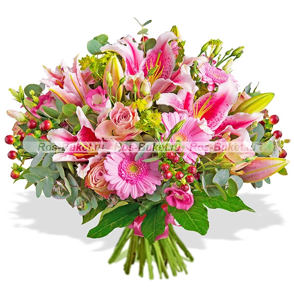 лилия розовая - 1 шт., роза розовая - 3 шт., гербера розовая - 3 шт., эустома розовая - 2 шт., гиперикум красный - 2 шт., эвкалипт - 2 шт., рускус - 2 шт., бант розовый.